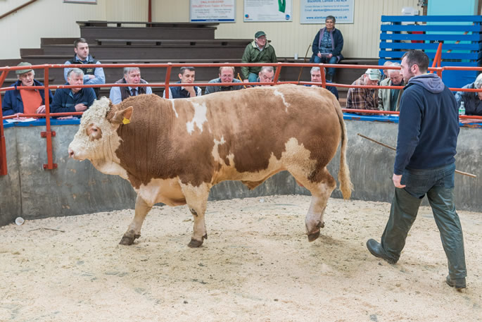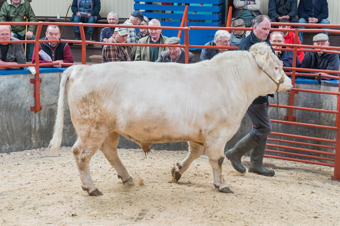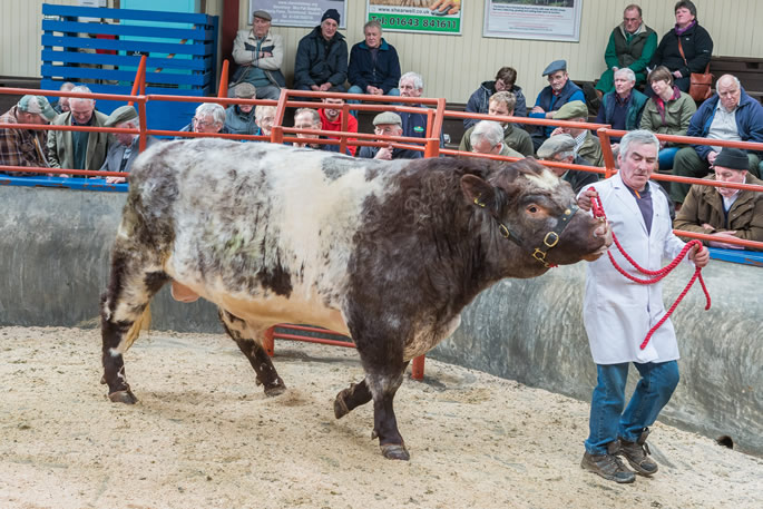 The top call of the day was 2,500gns for a Limousin shown by first time cattle vendors, J.M. & S.M. Priestley, Cracrop Farm, purchased by the Moss Side herd. Beef Shorthorns sold to 2,400gns from J.D.M. Thomson, Newlands, away to Meikle Whitriggs, Corrie. Next call was for a Simmental at 2,350gns sold by D.C. Houldey, Kirtleton House, bought by Mr Jardine, Dalbeattie. Black Limousin sold to 2,000gns from A. & A. Ewing, Dumbretton.